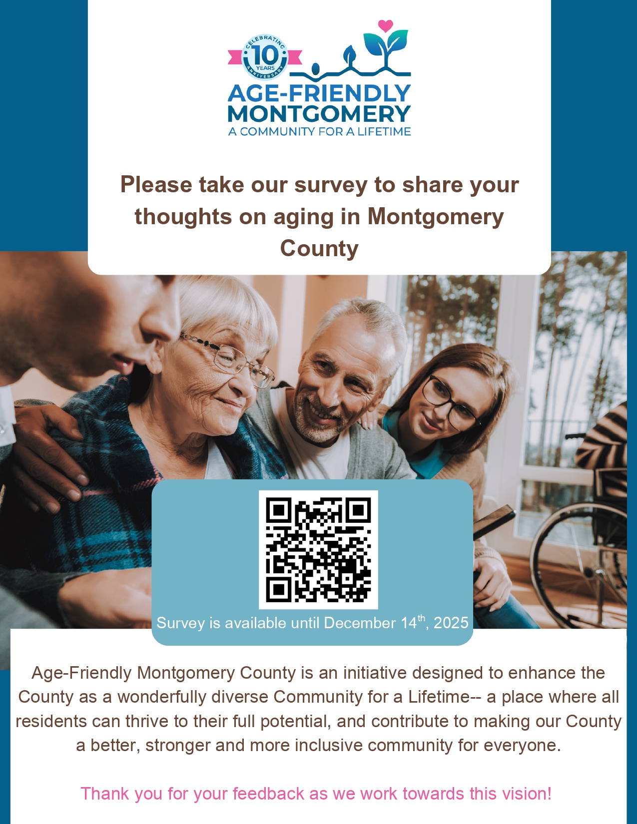 This survey is designed for adults living in Montgomery County who are 55 and older, though younger adults are welcome to participate as well. The survey takes approximately 20 minutes to complete. Residents can complete the survey between now December 14th.